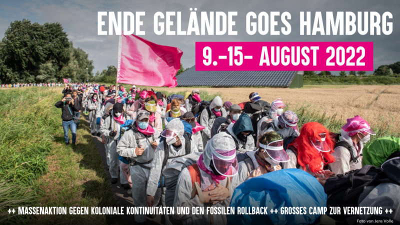 The mass action will take place as part of the System Change Camp in Hamburg on the Elly Wiesen near Volkspark Altona (August 9-15). We highly recommend to plan for the full period, because after 2 years of pandemic and isolation we take the space for exchange, networking and a great program !