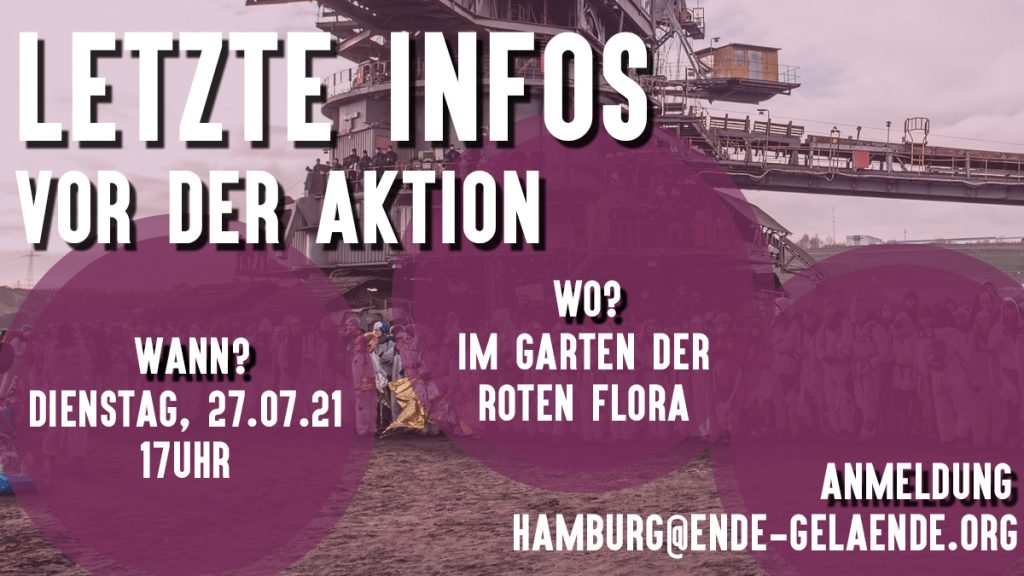 There’s only one week left until we will block neo-colonial, fossil infrastructure again. On Tuesday, July 27, at 5 PM you are invited to the Rote Flora (the garden is accessible via the door next to the red door), where we will give an overview and some last information for the action. The meeting is open to all those interested.