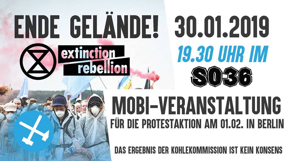 Wenn ihr Lust habt, mit uns auf die Straße zu gehen und zu zeigen, dass ihr nicht einverstanden seid, wenn ihr auch findet, dass das Ergebnis der Kohlekommission kein Konsens ist, dann kommt zu unserer Infoveranstaltung am 30.1. im SO36.