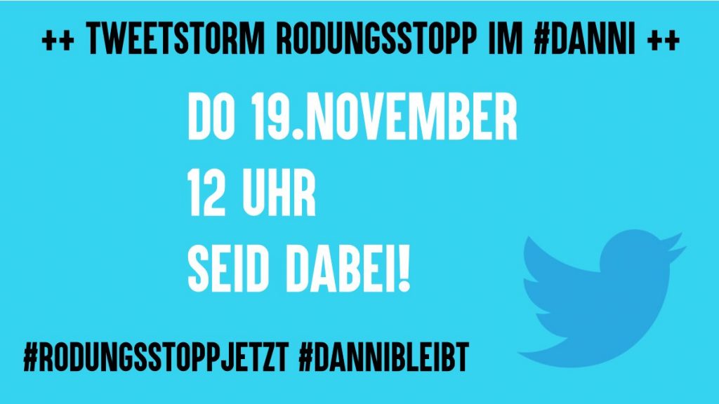 Nun ist Zeit zu handeln. Beteiligt Euch am Donnerstag, 12 Uhr am Tweetstorm. Fordert die Verantwortlichen von Grünen & CDU (@cdu_fraktion) dazu auf, den Einsatz & die Rodung sofort zu beenden! Nutzt für Tweets gern #rodungsstoppJETZT & #Dannibleibt.