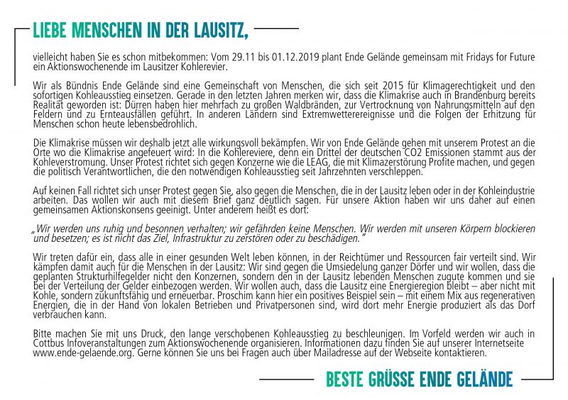 „Auf keinen Fall richtet sich unser Protest gegen Sie, also gegen die Menschen, die in der Lausitz leben oder in der Kohleindustrie arbeiten. Das wollen wir auch mit diesem Brief ganz deutlich sagen. Für unsere Aktion haben wir uns daher auf einen gemeinsamen Aktionskonsens geeinigt.“