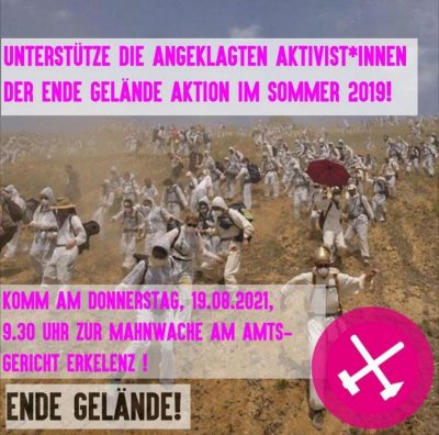 17. August 2021 Gerichtsverhandlung am 19.08 um 10 Uhr in Erkelenz. Anklagepunkt: Hausfriedensbruch im Braunkohletagebau Garzweiler im Juni 2019. Kommt ins Gericht oder zur Kundgebung vor dem Gericht in Erkelenz! Repression trifft einzelne, gemeint sind wir Alle! Weiterlesen ...