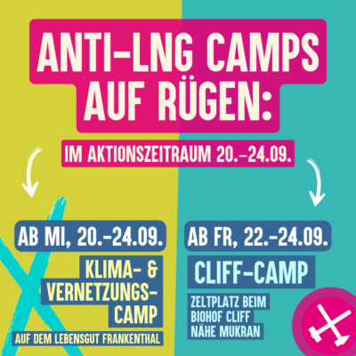 14. September 2023 Liebe Menschen, es gibt 🎉 RÜGEN-CAMP-NEWS! 🎉 Zur Aktion gegen LNG zwischen dem 20. und 24. September auf Rügen wird es zwei Camps geben: Weiterlesen ...