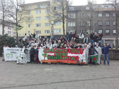 5. Februar 2018 Von Hamburg bis Genua und von Bristol bis Wien: Zum Aktionstag für gefangengenommene Aktivist*innen aus dem Hambacher Forst sind am Samstag, 3. Febraur, in zahlreichen Städten in Europa Menschen aus der Klimagerechtigkeitsbewegung auf die Straße gegangen, um sich mit den Waldbewohner*innen zu solidarisieren. Neun von ihnen waren am 22.01.2018 in Untersuchungshaft genommen worden, nachdem die Polizei mit einem Großaufgebot versucht hatte, Barrikaden im Hambacher Forst zu räumen. Weiterlesen ...