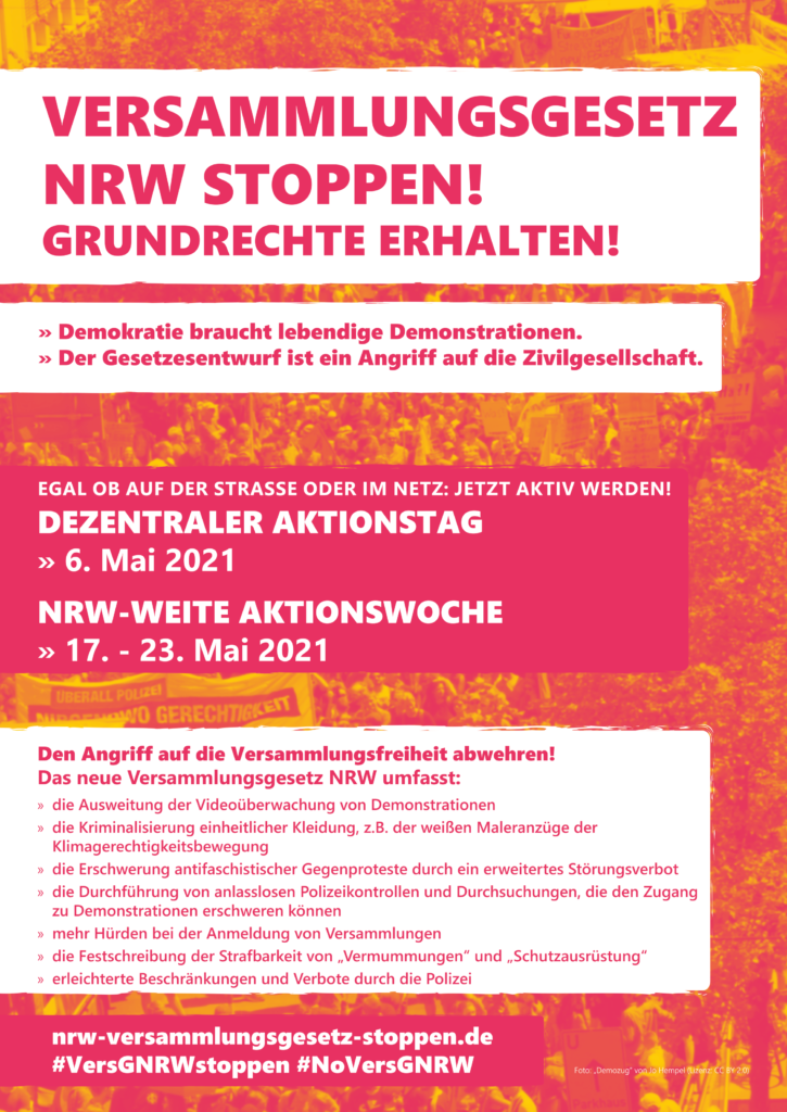 Unter dem Motto „#VersGNRWstoppen“ arbeiten Gruppen aus Zivilgesellschaft und außerparlamentarischem Aktivismus, aus Verbänden und politischen Parteien und interessierte Einzelpersonen gemeinsam an einer Verhinderung des Gesetzes, das voraussichtlich noch vor der parlamentarischen Sommerpause verabschiedet werden soll.
